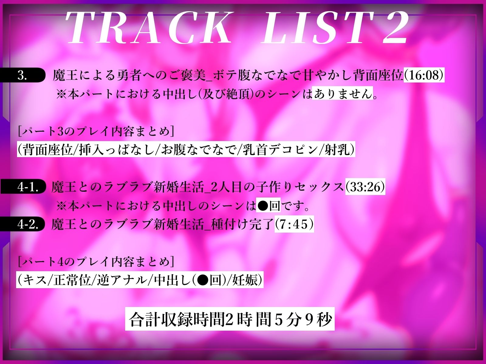 また、魔王の魔力を大量に含んだ精液を勇者の体内に注ぐ事で、魔王の子供はそれを吸収して更に強大な力を持った子に育つため、臨月が近づいているにも関わらず、勇者と魔王は今日も夫婦の営みに勤しみます。次のような願望を持つ、マゾヒストの男性の方向けの同人音声作品です。