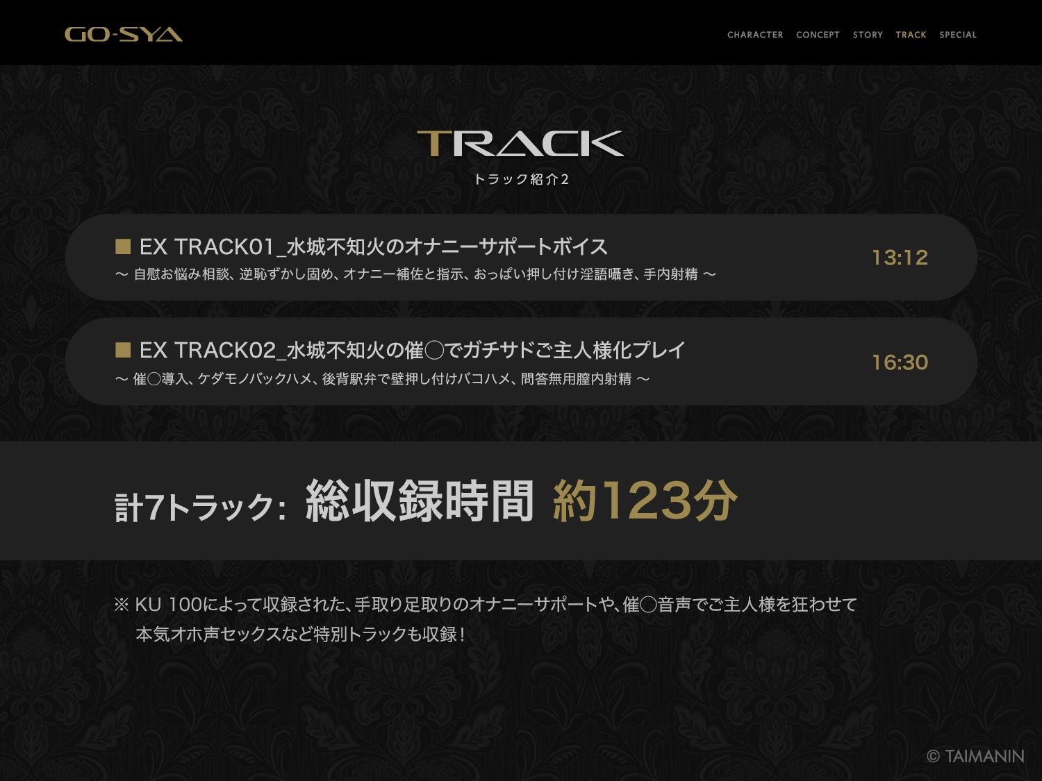 それだけでは飽き足らず、プレイルームではメス本能剥き出しの逆レ騎乗位でご主人様の子種を徹底的に搾り尽くす!KU-100によって収録された、手取り足取りのオナニーサポートや、催◯音声でご主人様を狂わせて本気オホ声セックスなど特別トラックも収録!